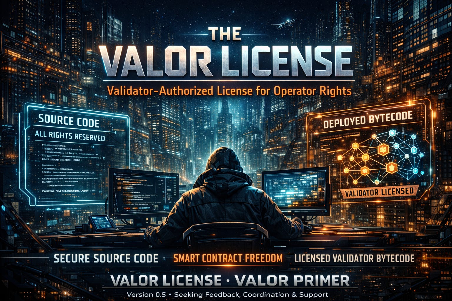 The result is a framework that lets a developer retain full control over smart contract source code (preventing unauthorized forks, redeployment, and derivative works) while affirmatively resolving the otherwise-ambiguous copyright status of validator execution — and doing so in a way that makes the deployed infrastructure legally durable, resistant to unilateral disruption, and stable across contentious chain forks.