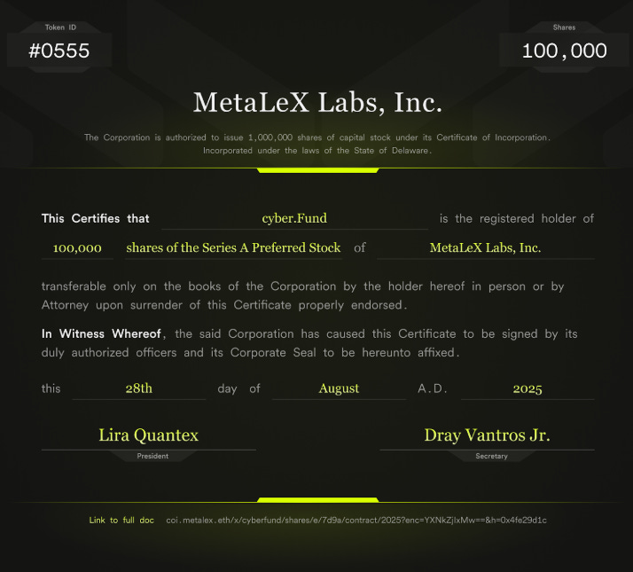 A major theme of MetaLeX’s vision is blurring the lines between traditional corporations and decentralized autonomous organizations. In the future, a cyberCORP might seamlessly interface with DAO communities – imagine a Delaware corporation that issues a class of stock to a community-run DAO, so that onchain governance by the community directly influences corporate decisions.