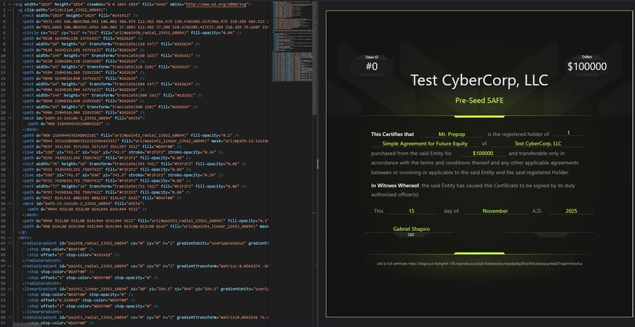 SVG code to generate a visual representation of this information, looking much like a traditional securities certificate with the image fully stored and rendered onchain– — no external hosting required