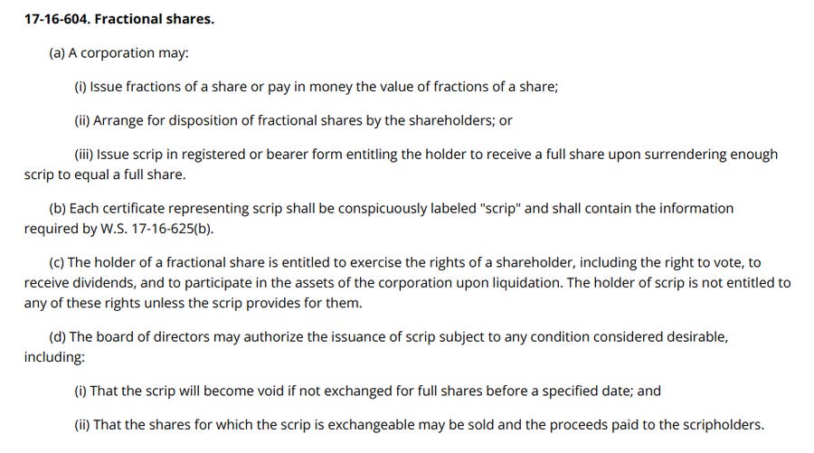 This strategy also is embedded in most corporate statutes, which expressly authorize issuing scrip to represent fractional shares of stock. For example, here is the relevant provision of the Wyoming Business Corporation Act Art. 6, §17-16-604: